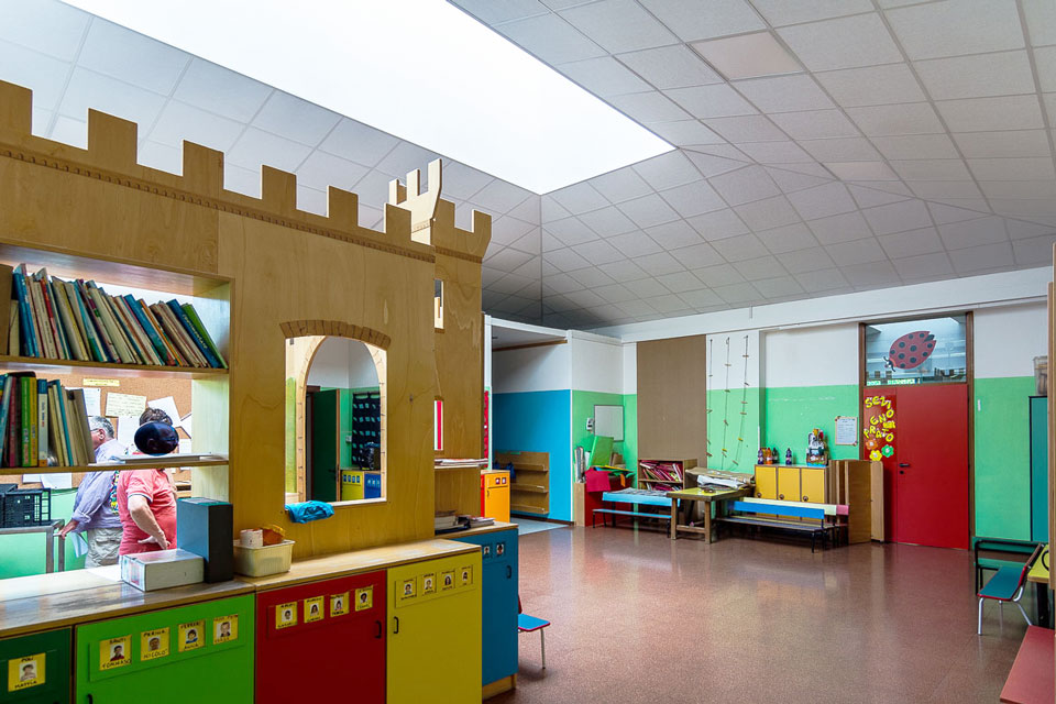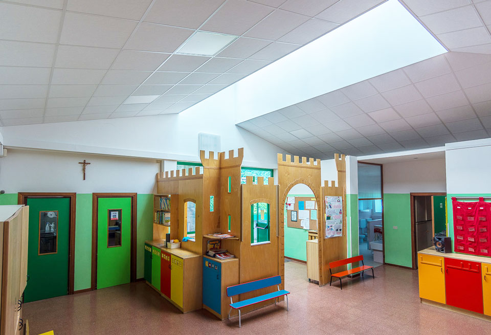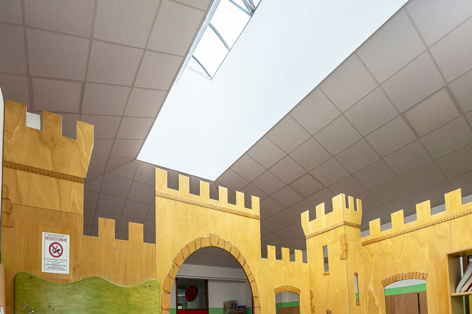 Problema risolto: la zona comune della scuola materna è il luogo per eccellenza dell’aggregazione dei bambini durante la giornata e nei momenti di festa con genitori e parenti. In questi momenti la grande hall diventava invivibile per il frastuono creato dal chiacchericcio di tutti.