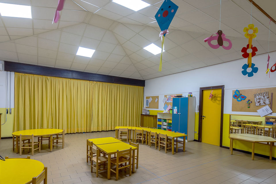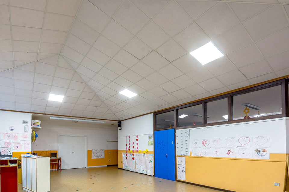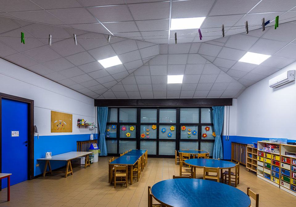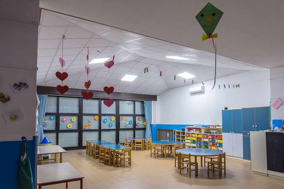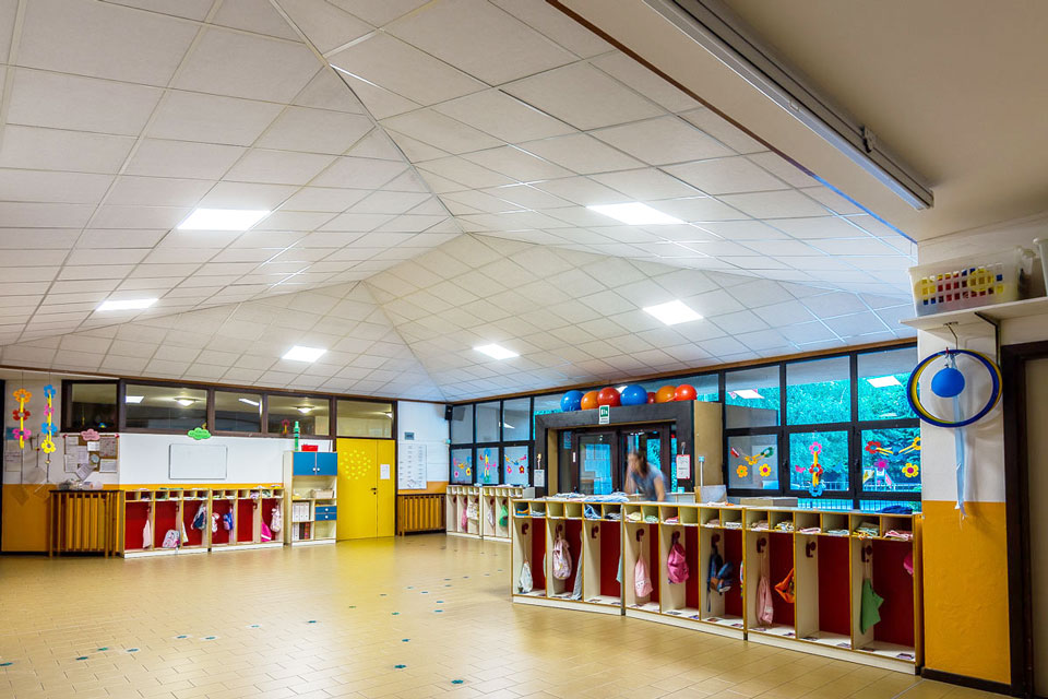 Problema risolto: la zona comune della scuola materna è il luogo per eccellenza dell’aggregazione dei bambini durante la giornata e nei momenti di festa con genitori e parenti. In questi momenti la grande hall diventava invivibile per il frastuono creato dal chiacchericcio di tutti.