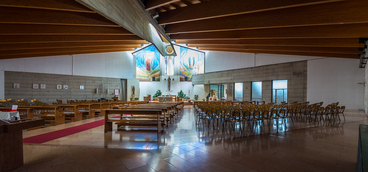 Nella chiesa principale sono stati utilizzati pannelli solo a pareti per non compromettere l’aspetto architettonico della copertura in legno.