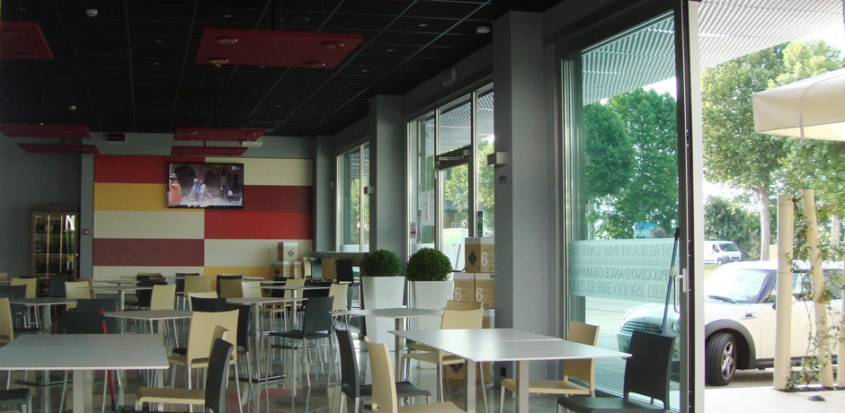 Correzione acustica di un’ampia zona ristorazione e bar, mediante la realizzazione di un controsoffitto a pannelli ispezionabili (in questo caso di colore nero), su tutta la superficie del locale.